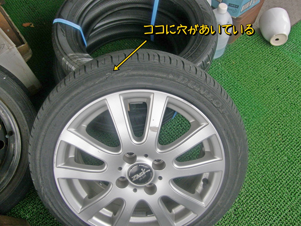 パンクしたのは左リアタイヤ。確認したら側面に思いっきり穴があいている。