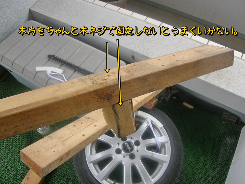 よし、ビート落としやってみよう。前から作戦は考えていたのだが、突然の出来事だったので、工具などは準備できていない。でもビート落としなら木材だけでできそうなのでチャレンジ。マンションの躯体に木材を引っ掛けてテコの原理でビートを押し込んでいく。