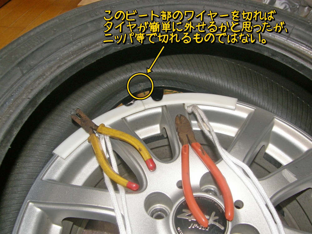 ホイール側のテープ跡もきれいにしなくちゃね。クリーニングするんだったらやっぱりタイヤがじゃまだ。ビート部のワイヤーを切ればペロっとタイヤ外れるだろうと思い、ニッパーで切れないか試したがまったく刃が立たない。そりゃそうだ。