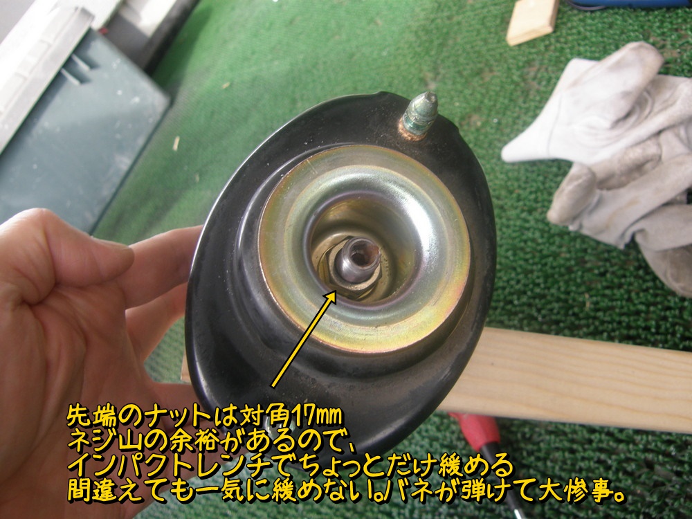 17mmナットはネジ山に余裕があるので、数回転緩めたら後はバネを圧縮してからはずせばいい。でも一気にナットを外してしまうと圧縮されたバネが一気に伸びて大変危険なので注意。