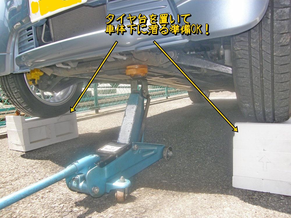 タイヤ台を置いて車体下に潜りこむ準備が整う(安全第一)。