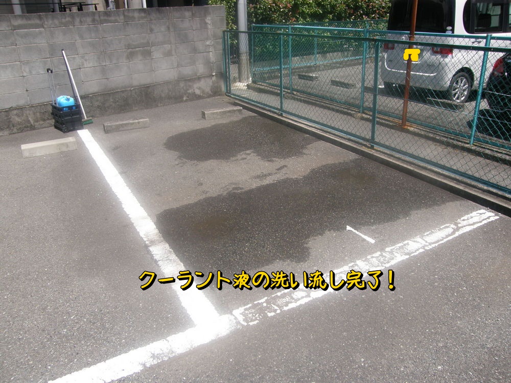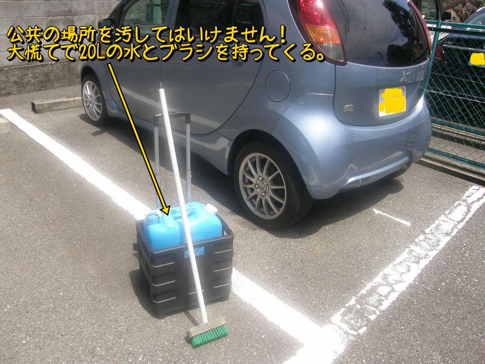 公共の場所を汚してはいけません。大急ぎで水入り20Lポリタンクとブラシを持ってきてお掃除だ。