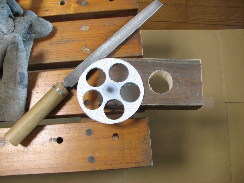 これで旋盤切削は終了。旋盤から取り外し、フィルタ穴をくりぬくためドリル径どんどん大きくして中心部をくりぬく。できればフィルタ穴も旋盤やらフライス盤でくり抜きたいんだけど、我が家の設備ではこのようにちまちまするしかないのです。