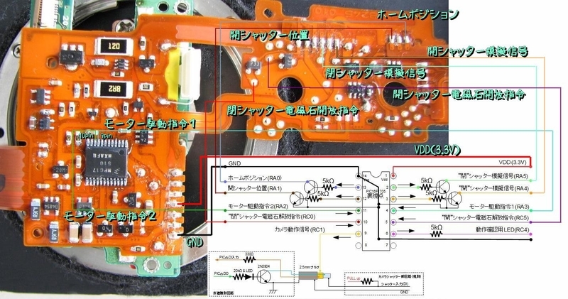 細かいはんだ付け作業はよくよくみるとかなりあやしいのだが、一応動作はしている。でもちょっと力が加わるとすぐにはんだ付けしたところがポキッとしそうなので、エポキシを流し込んで固めている。これらの涙ぐるしい努力の結果、二号機のシャッター模擬回路は下写真のようにかなりコンパクトになった。
