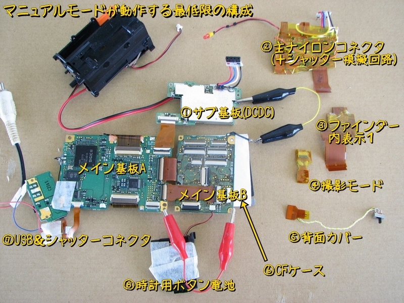 マニュアルモードが動作する最低限の構成が下写真となる。メイン基板AとBに①~⑧のパーツを取り付ければカメラとして機能する(あとCMOSセンサ)。