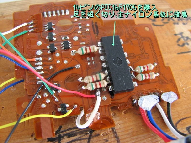 さて、PICの取り付けであるが、今回は主ナイロン基板上に直付けする。まずPICにプログラムを書き込み、足を短く切断し、ナイロン基板上にエポキシで接着。