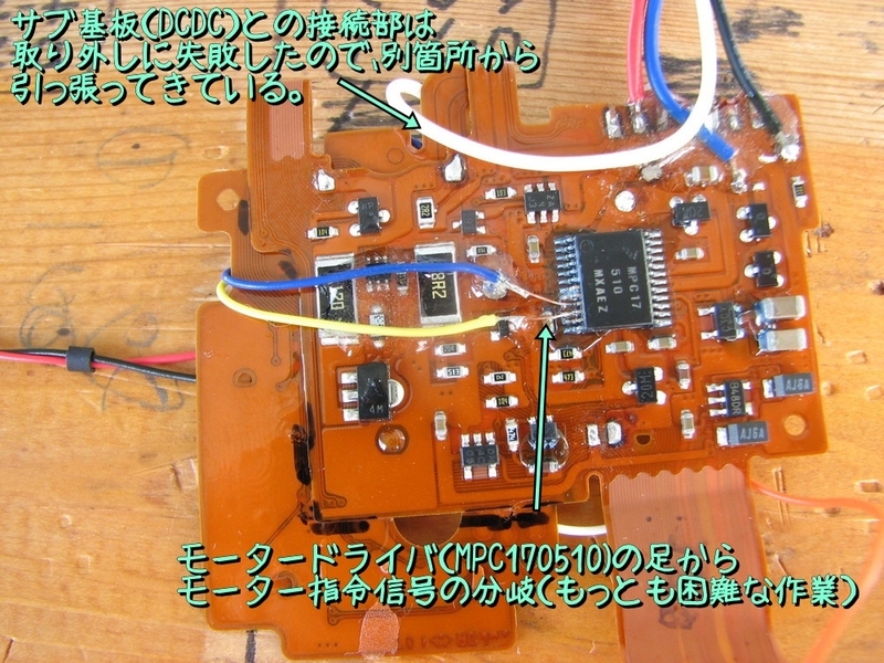 将来まで興味が続けば、サブ基板(DCDCコンバータ)もなしにしたい。サブ基板はバッテリーの7.4Vから3.3Vと5Vを作り出している(たぶん)。シャッター巻き上げモータとフラッシュ充電はおそらく7.4Vを使い、あとの電子回路は3.3Vと5Vで動いていると思われる。このあたりの構成を把握すれば、3.3Vと5Vだけでカメラは動くと思うのだ。そうすればエネループ3本(3.6V)と4本(4.8V)で動作できるのでは・・・と目論んでいるのだ。それに、DCDCはスイッチングノイズを出すしねぇ。だから鉄板でがっちりシールドしているのだろう。DCDCなしでエネループ駆動にすればノイズもだいぶ減りそう。