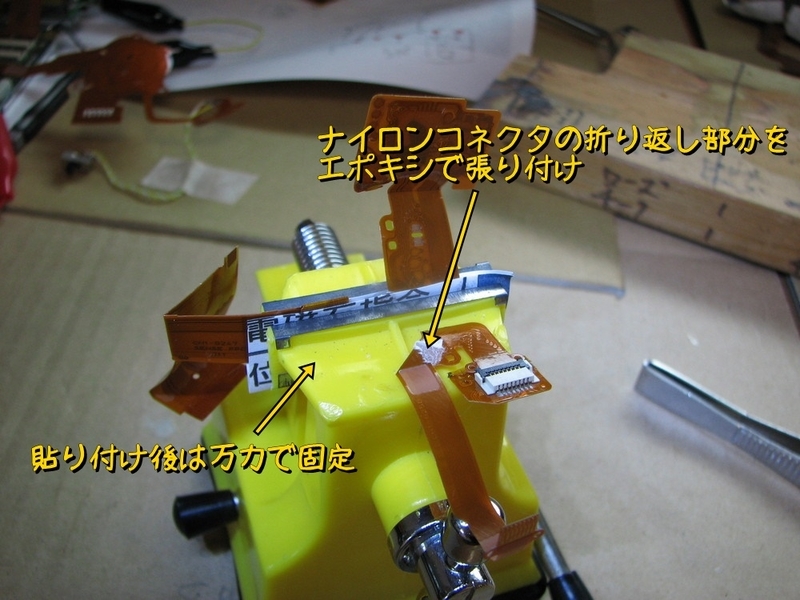細かい話になるが長いナイロンコネクタも以外にかさばる。折りたたんで絶縁テープでまいていると、ナイロンの弾性で元に戻ろうとしてまるく膨らみ結構かさばる。で、折りたたんだところをエポキシで接着し、万力で固定した。
